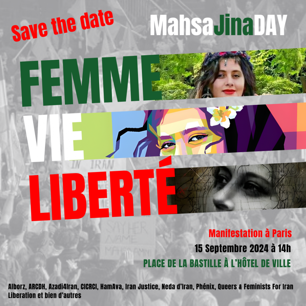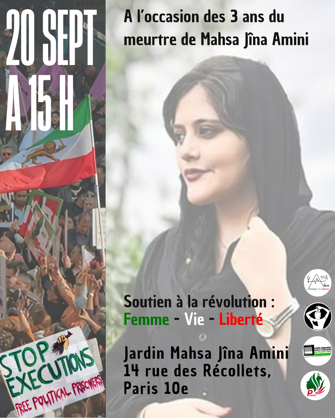 À l’occasion du triste anniversaire de la mort de Mahsa-Jîna Amini, en hommage à la révolution Femme-Vie-Liberté et en mémoire des victimes, les associations de la diaspora iranienne vous invitent à un rassemblement le 20 septembre 2025 à 15 heures au jardin Villemain – Mahsa-Jîna Amini, situé dans le 10ème arrondissement de Paris.
