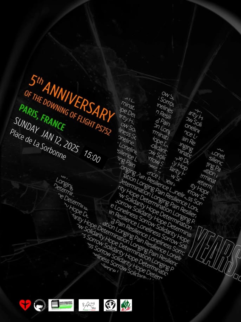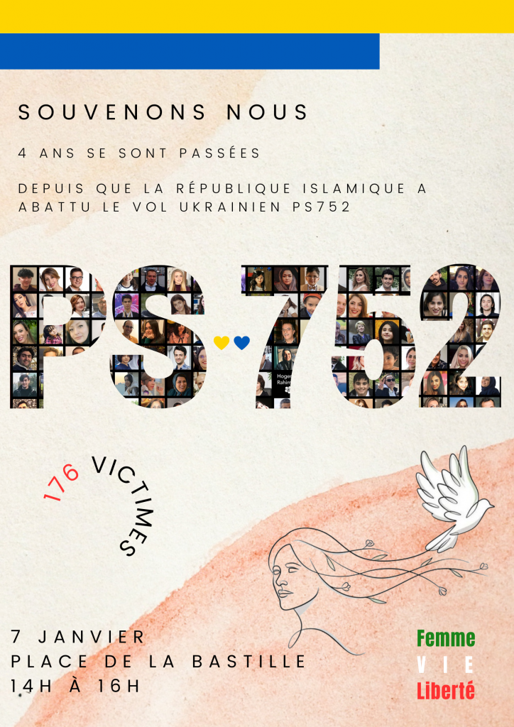 Rendez-vous ce dimanche 12 janvier à 15h à Paris, place de la Sorbonne pour rejoindre l’appel international de @ps752justice et de @globalnetworkwlf afin de commémorer les victimes du #flight752 abattu par les Gardiens de la Révolution il y a cinq ans