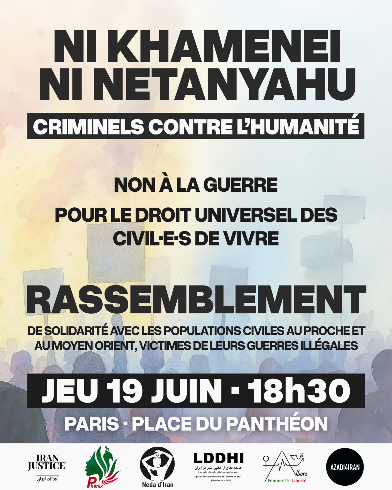 APPEL à un rassemblement de la société civile et des militant.e.s des droits humains JEUDI 19 JUIN 2025 à 18h30 place du Panthéon pour s’opposer à la guerre et exiger un cessez-le-feu immédiat, contre la tyrannie et l’impérialisme de Khamenei au Proche et au Moyen-Orient